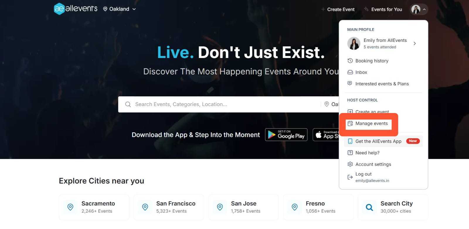 Go to the profile dropdown on the top right of the website and click on the "Manage Events" option.